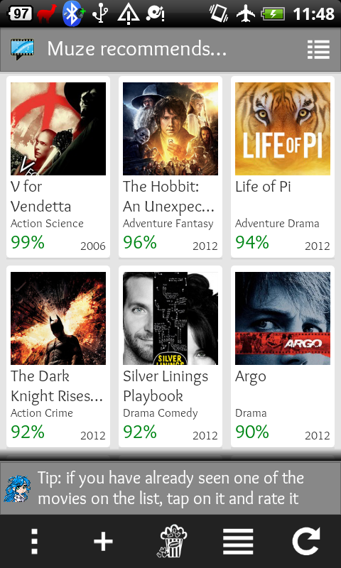 Para iniciar, você deve avaliar 5 filmes. Então o app irá criar uma bonequinha que irá te falar os filmes recomendados para você.